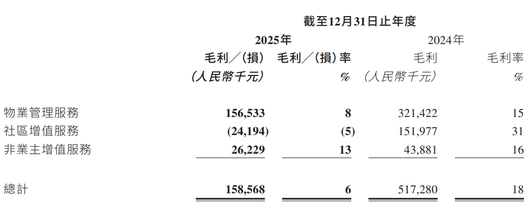 利润方面,期内,公司杀青毛利1.59亿元,较2024年同期的5.17亿元着落约69%;全体毛利率由2024年的18%着落至2025年的6%,主如果由于物业惩办处事及非业主升值处事的毛利率着落,加上上述存货出现减值损失,导致小区升值处事产生亏本。